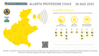 La Protezione Civile del Veneto ha emesso l’Avviso di Criticità Idrogeologica e Idraulica n. 50/2025, valido dalle ore 14:00 di giovedì 28 agosto fino alla mezzanotte di sabato 30 agosto, in previsione di una fase di marcato maltempo che interesserà l’intero territorio regionale. Le condizioni meteorologiche saranno caratterizzate da spiccata instabilità, con temporali localmente intensi, accompagnati da forti rovesci, grandinate e raffiche di vento, soprattutto tra il pomeriggio/sera di oggi e la mattinata di domani, venerdì 29 agosto.