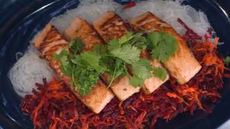- Disponi gli spaghetti di riso al centro del piatto, adagia sopra i filetti di salmone e completa con le verdure grattugiate a lato. Guarnisci con foglioline di coriandolo fresco e, se gradito, un’ulteriore spruzzata di lime.
