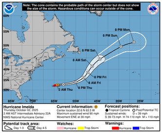 Le previsioni meteorologiche indicavano che Imelda avrebbe attraversato le Bermuda durante le prime ore di giovedì 2 ottobre, con venti sostenuti di forza uragano destinati a durare dalle quattro alle sei ore. Phil Rogers, direttore del Bermuda Weather Service, aveva avvertito che l’isola avrebbe sperimentato “bande significative di pioggia con temporali incorporati” e onde massime fino a 30 piedi di altezza.