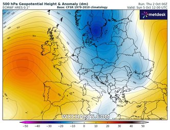 Scenario ben diverso per domenica 5 ottobre, giorno in cui la previsione subisce una modifica sostanziale alla luce degli ultimi aggiornamenti modellistici. Un’area depressionaria attualmente collocata sulla Penisola Scandinava inizierà a spingere verso sud masse d’aria di origine polare, particolarmente fredde e instabili, che raggiungeranno il bacino del Mediterraneo nel corso della notte tra sabato e domenica. Sarà proprio questo impulso a dare avvio a una fase di maltempo diffuso.