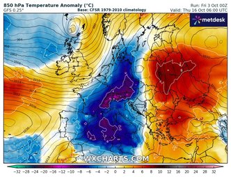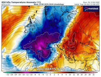 A partire dal 14 ottobre una massa d’aria artica scivolerà verso sud portando un abbassamento delle temperature molto marcato in gran parte del continente. Le anomalie termiche previste a circa 1500 metri di quota raggiungeranno in diversi settori valori di 8-10 gradi sotto le medie climatiche, un segnale chiaro che l’autunno è pronto a mostrare il suo volto più rigido.