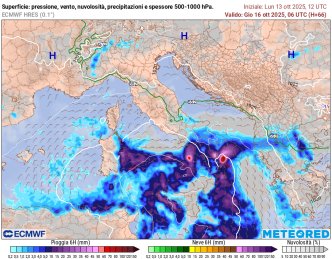 L’apice del maltempo è atteso tra giovedì e venerdì. Nella giornata di giovedì 16 ottobre, piogge abbondanti e temporali, localmente di forte intensità, interesseranno gran parte della Puglia (in particolare Bari, Lecce, Taranto, Foggia e Brindisi), la Basilicata (Potenza, Matera), la Campania centro-meridionale (Napoli, Salerno, Benevento, Caserta), la Calabria (Catanzaro, Vibo Valentia, Crotone, Reggio Calabria) e ancora la Sicilia settentrionale ed orientale (Palermo, Messina, Catania). Fenomeni più isolati ma comunque significativi sono attesi anche sul Molise meridionale (Termoli, Campobasso), sul basso Lazio (Formia, Gaeta) e sul basso Abruzzo, in particolare nel Chietino.