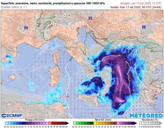 Venerdì 17 ottobre, la struttura ciclonica si sposterà verso lo Ionio, mantenendo attiva una circolazione instabile sul basso Adriatico, dove si attendono ancora piogge diffuse tra Puglia centro-meridionale, Basilicata ionica e Calabria ionica (Locride, Marchesato crotonese). Anche la Sicilia settentrionale sarà ancora coinvolta da rovesci residui, specie tra Messinese e Palermitano. Inizia invece un graduale miglioramento sulla Sardegna, dove i fenomeni andranno scemando già nel corso della mattinata di venerdì, così come sulla parte occidentale e centrale della Campania.