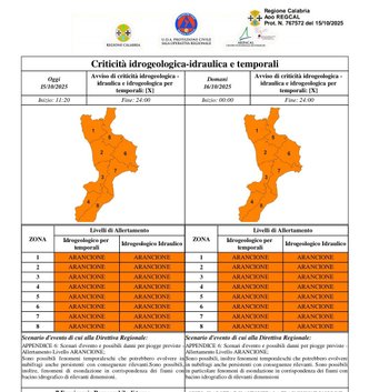La Protezione Civile della Regione Calabria ha diramato un’Allerta Meteo ARANCIONE per rischio idraulico e idrogeologico da temporali su tutto il territorio calabrese, valida dalle ore pomeridiane di oggi, mercoledì 15 ottobre, fino all’intera giornata di domani, giovedì 16 ottobre 2025. L’avviso riguarda in particolare le aree meridionali e ioniche della regione, dove sono attese condizioni meteorologiche fortemente perturbate.