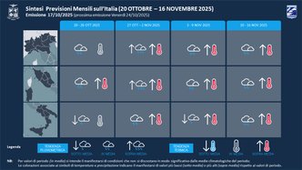 Le previsioni mensili dell’Aeronautica Militare per il periodo compreso tra il 20 ottobre e il 16 novembre 2025 delineano un quadro atmosferico contrassegnato da una persistente anomalia termica positiva sull’intero territorio nazionale, con un graduale riequilibrio dei regimi pluviometrici man mano che ci si avvicina alla metà di novembre. Le indicazioni, di natura probabilistica e riferite a deviazioni dai valori medi climatologici, offrono uno sguardo d’insieme utile per intercettare tendenze di fondo ed eventuali segnali precoci di eventi estremi.