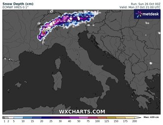 Un’intensa dinamica atmosferica interesserà l’arco alpino nella giornata di lunedì 27 ottobre, quando un fronte caldo di origine atlantica si appoggerà al versante settentrionale delle Alpi, sfondando parzialmente anche sul lato meridionale. L’evento sarà reso particolarmente interessante dal contesto termico preesistente: l’arrivo di aria fredda e secca da nordest nelle ore precedenti predisporrà infatti le condizioni ideali per un temporaneo abbassamento del limite delle nevicate, localmente sin verso i 1100-1200 metri di quota.