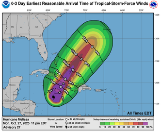La traiettoria prevista indica che il centro di Melissa si avvicinerà o attraverserà la Giamaica nella notte tra lunedì e martedì, per poi proseguire verso Cuba sud-orientale nella tarda serata di martedì e infine attraversare le Bahamas sud-orientali mercoledì. Si prevede un graduale spostamento verso nord-ovest e nord durante la giornata di martedì, seguito da un’accelerazione verso nord-est a partire da mercoledì che continuerà almeno fino a giovedì. Il National Hurricane Center ha avvertito di “non avventurarsi all’esterno del rifugio sicuro” e di “non uscire durante il passaggio dell’occhio del ciclone sulla vostra area”, poiché “la velocità di avanzamento di Melissa aumenterà e l’occhio comincerà a muoversi molto rapidamente attraverso l’isola”.