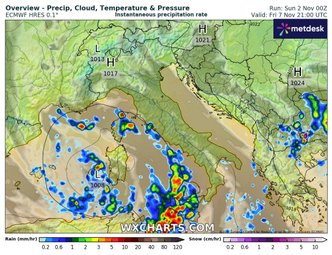 Tra venerdì 7 e domenica 9 novembre è atteso un netto peggioramento delle condizioni meteorologiche sul Mediterraneo centrale, con la formazione di un ciclone a tutte le quote che interesserà principalmente le regioni centro-meridionali italiane. Si tratterà di una depressione ben strutturata, tipica del periodo autunnale, che evolverà rapidamente sul basso Tirreno, alimentata da un flusso umido meridionale in quota e da contrasti termici marcati nei bassi strati.