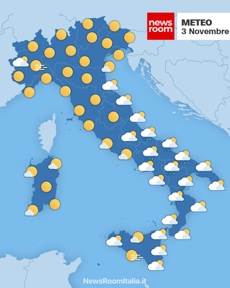 Italia – Il quadro meteorologico per l’Italia di domani, 3 Novembre, vede un graduale aumento dell’instabilità atmosferica al Centro-Sud associata a una perturbazione in avvicinamento. La pressione atmosferica risulta in locale diminuzione sulle regioni meridionali, mentre al Nord permane un campo di alta pressione con condizioni generalmente stabili. Le temperature saranno miti in Sardegna e al Sud, con valori massimi che raggiungono i 24°C, mentre al Nord si manterranno più contenute tra 6°C e 19°C. Prevarranno cieli sereni o poco nuvolosi al Nord e in Sardegna, mentre il Centro e il Sud saranno interessati da rovesci e annuvolamenti variabili, soprattutto lungo le coste adriatiche e tirreniche meridionali.