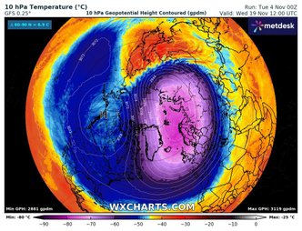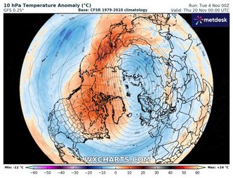 Ed è proprio questo il punto di attenzione per i prossimi giorni. I modelli meteorologici a medio-lungo termine evidenziano un progressivo raffreddamento della colonna d’aria sull’Artico, con temperature in stratosfera in sensibile diminuzione già in questi primi giorni di novembre. Al tempo stesso, si osservano segnali di un possibile blocco anticiclonico in sviluppo tra l’Atlantico settentrionale e la Groenlandia, configurazione favorevole alla propagazione di onde troposferiche verso l’alto e quindi a un potenziale disturbo del Vortice Polare.