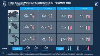 Secondo le previsioni mensili fornite dal Servizio Meteorologico dell’Aeronautica Militare, il mese di novembre 2025 si prospetta caratterizzato da un’anomalia termica positiva su gran parte del territorio nazionale, con un regime pluviometrico generalmente in linea o lievemente inferiore alla media climatologica del periodo, ad eccezione di alcune aree settentrionali.