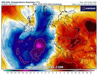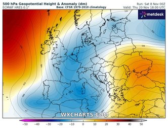Sul fronte termico, il passaggio perturbato sarà seguito da un’irruzione di aria artica che, tra il 20 e il 21 novembre, determinerà un abbassamento marcato delle temperature su gran parte dell’Europa centro-meridionale, Italia inclusa. Per la prima volta in questa stagione, i valori termici si porteranno al di sotto delle medie climatologiche del periodo, segnando l’avvio della stagione fredda anche al suolo. Le isoterme previste in quota (con valori tra 0 e -4°C a 850 hPa su diverse regioni del Centro-Nord) suggeriscono un ritorno delle nevicate fino a quote collinari sulle Alpi e, localmente, sull’Appennino settentrionale.