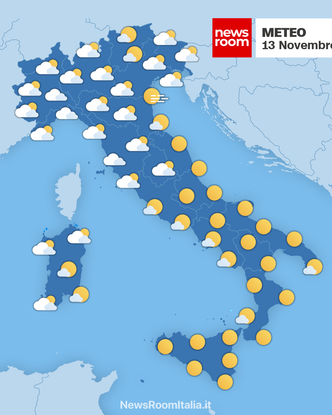 Italia – L’Italia è interessata da un vasto campo di alta pressione che favorisce condizioni di tempo stabile e un clima mite tipico dell’estate di San Martino. La pressione atmosferica risulta generalmente elevata su tutto il territorio nazionale, con temperature che oscillano tra valori miti nelle regioni meridionali e più freschi ma non eccessivi al Nord. Il Centro-Sud e la Sardegna godranno di ampi spazi di sole, mentre al Nord e in Toscana aumenta la presenza di nuvole, a tratti compatte, con locali nebbie mattutine e modeste pioviggini in Liguria.