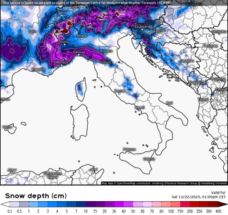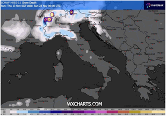 La mappa di cumulata nevosa al suolo prevista entro 240 ore mostra un’ampia area innevata estesa dal Piemonte al Friuli Venezia Giulia, con accumuli significativi attesi tra Veneto, Trentino-Alto Adige e Friuli. Le Alpi orientali e le Prealpi fanno registrare i quantitativi maggiori, ma ciò che sorprende è la possibile estensione del manto bianco fino alla bassa pianura, in particolare tra le province di Verona, Vicenza, Udine, Pordenone e Bolzano. Anche parte dell’Emilia e della Lombardia centro-orientale potrebbe essere interessata da fenomeni nevosi, seppur con accumuli più irregolari. Il Piemonte, al momento, appare meno coinvolto, ma resta sotto osservazione per possibili aggiustamenti nelle prossime corse.