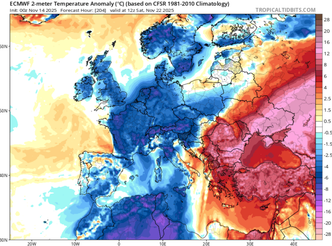 Il primo afflusso di aria fredda dovrebbe iniziare a farsi sentire già nel fine settimana, con l’ingresso di masse d’aria polare marittima pilotate da un’ampia saccatura nord-atlantica in discesa lungo l’Europa occidentale. I valori termici in quota subiranno un calo significativo, con l’isoterma di 0 °C a 850 hPa (circa 1300 metri) che potrebbe raggiungere anche la pianura padana nella fase culminante dell’irruzione, tra il 22 e il 23 novembre. Su Alpi e Prealpi settentrionali si prevede l’arrivo di masse d’aria ancora più fredde, con temperature comprese tra -4 e -6 °C a 850 hPa, valori che favorirebbero nevicate anche abbondanti, specie lungo i versanti esteri e di confine.