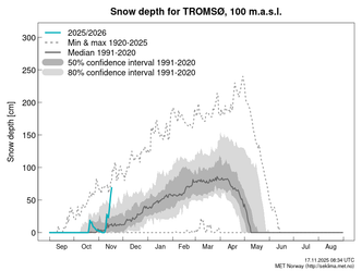In genere, Tromsø inizia ad accumulare neve al suolo tra la fine di ottobre e i primi giorni di novembre, ma raramente, in questa fase precoce dell’inverno sub-artico, si osservano accumuli superiori ai 60 cm. La soglia dei 70 cm rappresenta quindi un’anomalia significativa, che anticipa condizioni tipiche dei mesi centrali invernali — come febbraio o marzo — quando il bilancio nivometrico risente del progressivo accumulo stagionale e delle basse temperature persistenti.