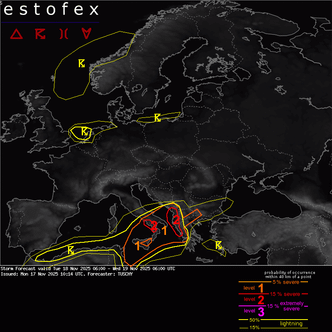 Il Centro Europeo per la Previsione Sperimentale delle Tempeste, noto con l’acronimo ESTOFEX (European Storm Forecast Experiment), ha emesso un’allerta di livello 2 valida dalle ore 06:00 UTC di martedì 18 novembre 2025 fino alle 06:00 UTC di mercoledì 19 novembre. L’area interessata comprende ampie zone del sud-ovest dell’Italia, in particolare la Campania e il settore tirrenico meridionale, nonché l’Adriatico meridionale, il Mar Ionio nord-orientale, il Montenegro, l’Albania e parzialmente la Grecia nord-occidentale e la Bulgaria sud-occidentale. Il bollettino segnala un rischio marcato di precipitazioni eccessive, raffiche di vento severe, grandinate localmente di grandi dimensioni e la possibilità di eventi tornadici.