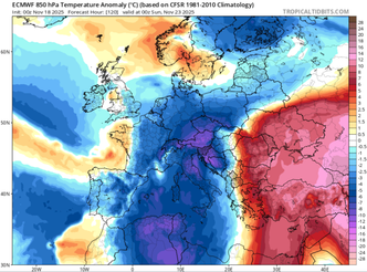 Contestualmente, le temperature subiranno un ulteriore deciso calo, con valori massimi che, su molte località del Nord e dell’Appennino, non supereranno i 6-8°C. Al Centro-Sud, il crollo termico sarà meno marcato ma comunque significativo, con differenze fino a 8-10°C rispetto ai giorni precedenti. Il profilo termico generale si porterà al di sotto delle medie stagionali, specie al Centro-Nord, con anomalie negative anche superiori ai 3°C.