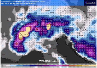 Nel corso della notte tra venerdì 21 e sabato 22 novembre, e durante le prime ore del mattino seguente, le nevicate tenderanno a insistere soprattutto su basso Piemonte ed Emilia occidentale, mantenendosi a quote prossime al piano. In parallelo, l’estensione del fronte verso i settori centrali favorirà nevicate a quote collinari, dai 300 ai 600 metri, su Toscana interna, Umbria e Marche, in particolare nelle province di Arezzo, Perugia, Ancona e Macerata, dove l’apporto precipitativo sarà localmente abbondante.