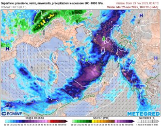 Lunedì 24 novembre sarà una giornata contraddistinta da spiccata instabilità, con precipitazioni diffuse, anche a carattere temporalesco, che interesseranno in particolare il Nord e le regioni centrali tirreniche. Il settore settentrionale sarà colpito soprattutto nella prima parte della giornata, con piogge battenti e possibili nubifragi sulla Liguria di Levante e sul basso Piemonte. Sul Triveneto si prevedono invece rovesci più persistenti nel corso del pomeriggio e della serata, accompagnati da un abbassamento della quota neve, che potrà scendere fino a 400–600 metri su Veneto e Friuli Venezia Giulia, imbiancando le zone collinari.