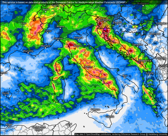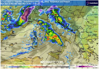 Martedì 25 novembre la situazione si complica ulteriormente con la formazione di un minimo depressionario al suolo centrato sulle regioni centrali italiane. Il ciclone, alimentato da un continuo afflusso di aria umida sud-occidentale, guiderà una nuova serie di fronti instabili, i quali andranno a colpire duramente soprattutto l’Emilia Romagna, il Triveneto e successivamente il Centro-Sud. Le precipitazioni risulteranno intense, persistenti e localmente a carattere temporalesco su Lazio interno, Toscana meridionale e Campania, dove si temono accumuli pluviometrici significativi che potrebbero causare locali criticità idrogeologiche.