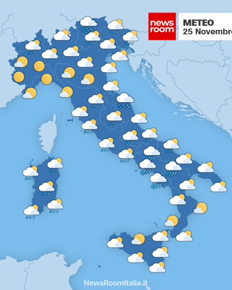 Nord: Nel settore nordoccidentale le condizioni saranno complessivamente serene o poco nuvolose con nubi sparse, soprattutto nelle grandi pianure lombarde e in Piemonte, dove i venti saranno generalmente deboli da ovest o nord-ovest e le temperature minime scenderanno fino a 0/2°C, con punte massime attorno a 8-10°C. Il Nordest presenterà ancora instabilità nel corso della mattina, con piogge soprattutto sul Friuli e Veneto orientale, mentre nel pomeriggio si avranno tendenze a schiarite. Le precipitazioni potrebbero risultare moderate nei settori più orientali. Le temperature minime oscilleranno tra 4°C e 9°C, con valori massimi che non supereranno i 9-11°C. I venti saranno generalmente deboli o moderati da sud-ovest sulla fascia orientale, attenuandosi in serata.