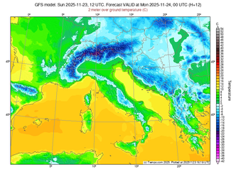 Nord: Il Nord Italia è interessato da una copertura nuvolosa estesa con precipitazioni generalmente deboli, che in alcune aree si presentano come nevicate a quote collinari soprattutto al mattino. I venti soffiano dal Libeccio e dallo Scirocco con intensità moderate, causando mari mossi o molto mossi lungo le coste. Le temperature massime si mantengono fra i 4-5°C in molte località e raggiungono punte di 11-12°C solo in alcune città come Trieste e Genova.