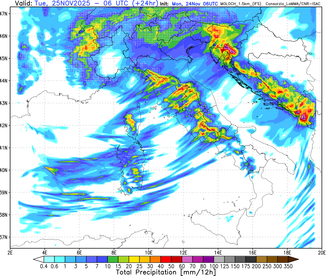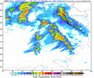 Il peggioramento inizierà nelle prossime ore di lunedì 24 novembre, quando il ciclone, alimentato da un marcato contrasto tra masse d’aria di diversa origine, inizierà ad agire sul territorio nazionale. Le correnti meridionali, prevalentemente di Scirocco e Libeccio, ricche di umidità dopo la traversata marina, saranno il motore di precipitazioni abbondanti e localmente torrenziali. Gli accumuli previsti sono considerevoli: secondo le ultime proiezioni modellistiche, potranno registrarsi cumulate comprese tra i 150 e i 200 mm (litri per metro quadrato) in intervalli temporali molto brevi, specie nelle aree soggette a stazionarietà delle celle temporalesche.