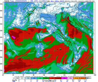 La situazione rimarrà altamente instabile anche nella giornata di martedì 25 novembre, con nuove precipitazioni intense che potrebbero colpire nuovamente le stesse aree, mantenendo elevato il rischio di allagamenti, esondazioni e frane. A ciò si aggiunge il vento: le raffiche, in particolare sui litorali tirrenici e sulle coste sarde e siciliane, potranno superare gli 80 km/h, con conseguente rischio di mareggiate violente e danni alle infrastrutture costiere.