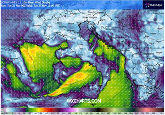 La svolta si concretizzerà a partire da mercoledì 26 novembre, quando il sistema perturbato si allontanerà gradualmente ma un vortice di bassa pressione resterà agganciato sulla Penisola, mantenendo condizioni instabili almeno fino a venerdì. L’ingresso delle correnti fredde settentrionali determinerà un nuovo e marcato calo delle temperature, con valori quasi invernali al Nord già a metà settimana. La Bora rinforzerà progressivamente sui bacini settentrionali, con raffiche previste fino a 70-80 chilometri orari tra Sardegna, Liguria, regioni centrali e mari prospicienti, mentre il Maestrale soffierà forte sull’isola sarda. Questa configurazione porterà a un’Italia meteorologicamente divisa in due: al Nord e su buona parte del Centro il tempo tenderà gradualmente a migliorare con cieli più sereni e clima più asciutto, mentre il Sud resterà ancora esposto a condizioni di instabilità con nubi, rovesci e venti moderati.