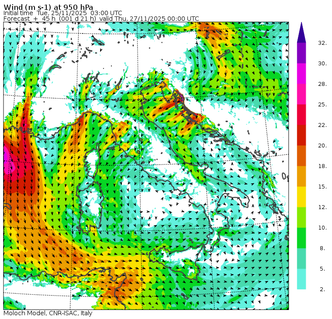 Le previsioni per giovedì 27 novembre indicano un progressivo miglioramento al Nord e in Toscana, dove il tempo sarà ben soleggiato, mentre la Romagna manterrà ancora un cielo nuvoloso con condizioni comunque asciutte. Le regioni centrali adriatiche e il Sud peninsulare resteranno invece interessati da precipitazioni frequenti, con possibili rovesci o temporali e neve lungo la dorsale appenninica. I venti di Bora, Grecale e Tramontana continueranno a soffiare con intensità fino a burrascosa tra Sardegna, Liguria e regioni centrali, rendendo i mari molto mossi fino ad agitati, in particolare i bacini attorno alla Sardegna.