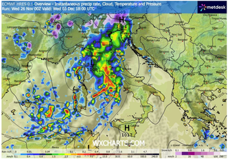 Il contesto sinottico atteso favorirà la formazione di un ciclone secondario in sede mediterranea, alimentato dal contrasto tra le masse d’aria polare in discesa e le correnti calde e umide preesistenti. Tale ciclone richiamerà intensi venti meridionali che, impattando contro le Alpi e gli Appennini, contribuiranno ad accrescere il potenziale precipitativo soprattutto sui versanti esposti. Le precipitazioni potranno risultare localmente molto abbondanti, in particolare sul Nord-Est, dove è attesa neve sulle Dolomiti oltre i 600-700 metri, e su gran parte del versante tirrenico, con picchi pluviometrici che potranno superare i 100 mm in poche ore su Campania, Lazio, Toscana, Sardegna occidentale e Sicilia.