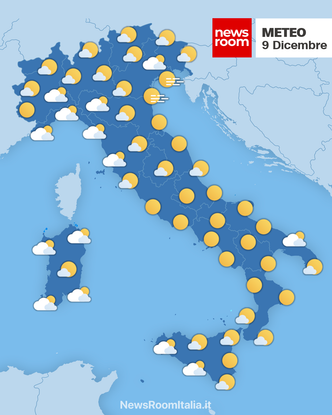 Nord: La Pianura Padana presenterà ampie estensioni di nebbia e foschia con cieli coperti o poco nuvolosi, in particolare nelle aree di pianura di Lombardia, Veneto ed Emilia-Romagna. Le temperature minime oscilleranno tra 1 e 5°C, con massime attorno agli 8-12°C. Locali foschie interesseranno anche le zone di pianura piemontesi e venete, mentre lungo le terre alte e i rilievi il cielo si presenterà generalmente poco nuvoloso o sereno. I venti saranno per lo più deboli da direzioni variabili, con intensità contenuta.