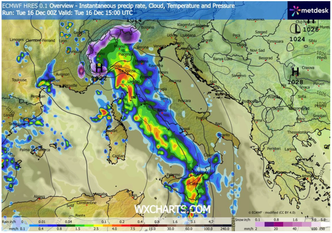 Questa configurazione barica determina un peggioramento progressivo delle condizioni meteorologiche a partire dalle regioni più occidentali, prime a essere investite dalle correnti sud-occidentali cariche di umidità. Già nella serata di ieri, lunedì 15 dicembre, le prime precipitazioni hanno interessato la Sardegna, in particolare il settore orientale dell’isola, dove si sono registrate piogge localmente moderate. Successivamente, il fronte perturbato si è esteso verso nord-est, coinvolgendo le coste tirreniche della Toscana, la Liguria e gran parte del Nord-Ovest. Nella prima parte della giornata di martedì 16 dicembre, il maltempo risulta ben organizzato su Piemonte, Liguria, Lombardia occidentale, Emilia e basso Veneto, con cieli coperti e piogge diffuse, localmente anche a carattere di rovescio.