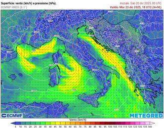 Il giorno di Natale, giovedì 25, si confermerà il regime ciclonico con ventilazione intensa. Sulla Liguria continuerà a soffiare una forte tramontana, mentre la Bora interesserà in modo deciso il Triestino e il medio Adriatico, con raffiche anche superiori agli 80 km/h. Nel contempo, un scirocco teso investirà il basso Adriatico, contribuendo a condizioni marine molto difficili. I mari risulteranno agitati ovunque, con particolare riferimento al litorale adriatico, dove saranno possibili mareggiate estese.