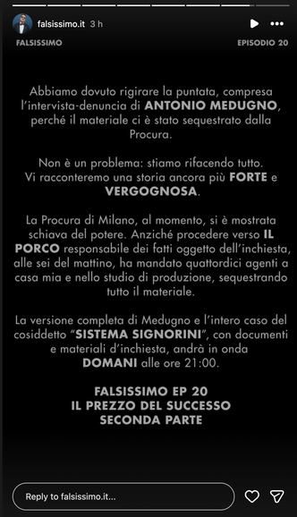 La procura di Milano ha disposto il sequestro di tutto il materiale che Fabrizio Corona aveva predisposto per la seconda puntata di Falsissimo dedicata al cosiddetto «caso Signorini», prevista inizialmente per la serata di lunedì 22 dicembre. L’intervento degli inquirenti, avvenuto alle prime ore del mattino di venerdì 20 dicembre, ha coinvolto sia l’abitazione sia lo studio di produzione dell’ex re dei paparazzi, con un’operazione che secondo quanto riferito dallo stesso Corona avrebbe visto l’impiego di quattordici agenti delle forze dell’ordine.