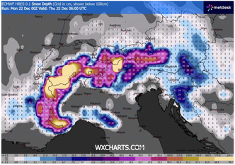 Le zone maggiormente coinvolte saranno il Cuneese, il Torinese occidentale e il medio-basso Canavese, dove l’effetto orografico potrà accentuare ulteriormente i fenomeni. In queste aree, tra lunedì sera e mercoledì mattina, si attendono cumulate pluviometriche elevate, con punte di oltre 120-150 mm, e altrettanto ingenti accumuli nevosi oltre i 1.800-2.000 metri di quota. Particolarmente interessati i comprensori sciistici di Limone Piemonte, Artesina, Prato Nevoso e il settore alto della Val Varaita e della Valle Stura, dove lo spessore del manto nevoso fresco potrebbe avvicinarsi, localmente, ai 180-200 cm entro il 24 dicembre.