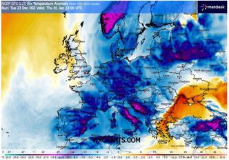 Tuttavia, sarà solo a partire dal 29 dicembre che si assisterà a un ulteriore e più marcato raffreddamento, dovuto alla formazione di un promontorio anticiclonico dinamico in estensione dalla Penisola Iberica verso le Isole Britanniche e la Scandinavia. Questo assetto favorirà un moto retrogrado dell’alta pressione, spingendo masse d’aria di origine artico-continentale a penetrare nel cuore dell’Europa centro-orientale e successivamente sull’area balcanica e l’Adriatico.
