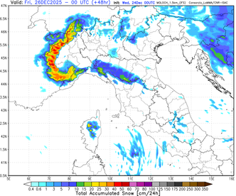 L’aria fredda richiamata dalla depressione abbasserà sensibilmente la quota neve, specie tra la serata del 24 e la giornata del 25 dicembre, favorendo nevicate fino a quote collinari in diverse zone del Settentrione. Gli accumuli più significativi sono attesi sull’arco alpino occidentale e sugli Appennini settentrionali. In particolare, si stimano 30 cm di neve fresca sulle Alpi Marittime e Cozie, con ulteriori 20–25 cm sull’Appennino Ligure di ponente e 10–15 cm sull’Appennino Emiliano. Accumuli di pari entità sono attesi anche sulla Val d’Aosta orientale e la Val Sesia.
