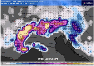 Secondo gli ultimi modelli numerici ad alta risoluzione, tra il tardo pomeriggio della Vigilia e la notte di Natale, la neve potrà raggiungere quote collinari – localmente anche inferiori ai 300 metri – su settori del Piemonte centro-meridionale e dell’Emilia occidentale. In particolare, nel cuneese, nell’alessandrino e tra l’Appennino piacentino e parmense, si attendono nevicate anche moderate, favorite dalla persistenza dei fenomeni e dalla maggiore esposizione orografica a correnti orientali nei bassi strati.