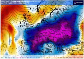 Su scala europea, il segnale dominante è rappresentato da un’ampia e persistente area di anomalia termica negativa che si estende dall’Europa settentrionale e orientale fino al bacino del Mediterraneo centrale. I valori previsti a 850 hPa risultano diffusamente inferiori alla media di riferimento di 8–12°C, con punte localmente ancora più accentuate sul settore centro-orientale del continente. Si tratta di uno scarto termico di assoluto rilievo climatologico, indicativo di una massa d’aria molto fredda, secca e di chiara estrazione continentale, in grado di produrre effetti rilevanti anche al suolo qualora supportata da adeguate dinamiche sinottiche.