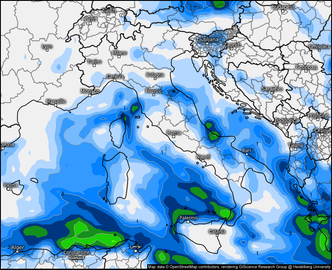 Il modello GFS (americano), invece, individua un rischio piogge più moderato sulla Calabria tirrenica (accumuli tra 10 e 20 mm), ma con precipitazioni sparse, per quanto di debole entità, anche su Campania, Toscana meridionale, Lazio, Marche centro-meridionali e Sardegna, in particolare nel settore sud-occidentale.