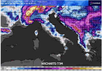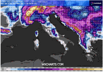 Per quanto riguarda la Pianura Padana, il segnale modellistico appare più sfumato ma comunque significativo: tra Piemonte orientale, Lombardia centro-occidentale ed Emilia occidentale il modello ipotizza accumuli generalmente compresi tra 5 e 15 cm, con possibilità di locali punte prossime ai 10–20 cm nelle aree più interne e lontane dall’influenza mitigatrice dei grandi centri urbani. Sui settori centro-orientali della pianura, in particolare tra bassa Lombardia, Emilia orientale e Veneto interno, la tendenza appare leggermente più favorevole, con accumuli che in alcuni scenari potrebbero raggiungere i 10–20 cm, specie nella giornata dell’11 gennaio, quando la persistenza del freddo al suolo e una migliore organizzazione delle precipitazioni sembrerebbero aumentare le probabilità di neve attecchente.