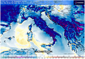 Freddo secco continentale in arrivo il 31 dicembre: gelo in Valpadana e nelle vallate interne del Centro, isoterme fino a -10 °C in quota ma con precipitazioni quasi assenti.