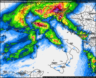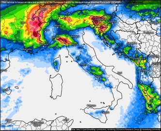 La fase più critica del peggioramento è attesa per domenica 4 gennaio, quando l’approfondimento del vortice sul Tirreno determinerà una decisa intensificazione dei fenomeni atmosferici. L’afflusso di venti meridionali, carichi di umidità e relativamente miti, incontrando l’aria più fredda presente in quota, genererà forti contrasti termici, condizione ideale per la formazione di temporali anche di forte intensità. Particolare attenzione andrà riservata a Liguria, alta Toscana e Triveneto, dove non si escludono nubifragi con accumuli superiori ai 100 mm in poche ore. Si tratta di quantitativi di pioggia potenzialmente in grado di provocare criticità idrogeologiche, specie nelle aree già sature di umidità.