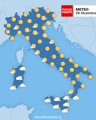 Italia – L’alta pressione è protagonista del meteo in Italia questo lunedì 29 dicembre, mantenendo la pressione in ulteriore aumento su tutto il territorio nazionale. Le temperature rimangono contenute, oscillando tra valori minimi intorno allo zero e massime che raramente superano i 15 gradi. La giornata si presenta generalmente soleggiata, fatta eccezione per la presenza di nubi più diffuse nelle Isole Maggiori e per foschie o nebbie lungo la Pianura Padana, che potrebbero persistere nelle ore centrali. Isolate deboli precipitazioni sono previste nel sud della Sardegna.