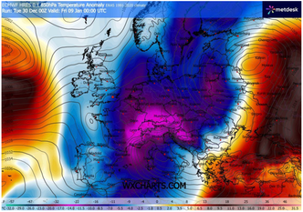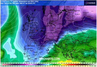 A partire da mercoledì 31 dicembre, l’aria artica inizierà a dilagare dalla Russia occidentale verso la Polonia, la Repubblica Ceca, la Slovacchia, l’Ungheria e la Romania, spingendosi rapidamente verso i Balcani, la Grecia e la Turchia. I modelli termici mostrano un repentino crollo delle temperature, con valori ben inferiori alla media stagionale, accompagnati da nevicate diffuse e abbondanti, attese fino in pianura. La fase clou dell’evento si concretizzerà tra il 3 e il 5 gennaio, quando l’irruzione fredda guadagnerà terreno anche verso l’Europa occidentale, coinvolgendo la Gran Bretagna, la Francia settentrionale, la Germania, la Scandinavia e, in seguito, la Penisola Iberica.
