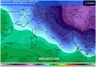 L’afflusso freddo sarà breve ma incisivo. Le elaborazioni modellistiche indicano il picco dell’irruzione in quota (a 1500 metri circa, isoterma 850 hPa) nel pomeriggio di mercoledì 31 dicembre, con valori diffusamente negativi su gran parte del territorio, e successiva propagazione al suolo durante la notte e la mattinata di giovedì 1 gennaio, complice una temporanea attenuazione del gradiente eolico.