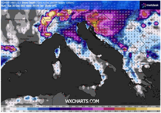 Per quanto riguarda la Pianura Padana, il segnale modellistico appare più sfumato ma comunque significativo: tra Piemonte orientale, Lombardia centro-occidentale ed Emilia occidentale il modello ipotizza accumuli generalmente compresi tra 5 e 15 cm, con possibilità di locali punte prossime ai 10–20 cm nelle aree più interne e lontane dall’influenza mitigatrice dei grandi centri urbani. Sui settori centro-orientali della pianura, in particolare tra bassa Lombardia, Emilia orientale e Veneto interno, la tendenza appare leggermente più favorevole, con accumuli che in alcuni scenari potrebbero raggiungere i 10–20 cm, specie nella giornata dell’11 gennaio, quando la persistenza del freddo al suolo e una migliore organizzazione delle precipitazioni sembrerebbero aumentare le probabilità di neve attecchente.