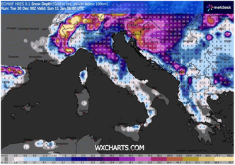 Le elaborazioni del modello ECMWF ad alta risoluzione, basate sulle mappe di profondità del manto nevoso valide tra il 9 e l’11 gennaio, delineano una tendenza che merita particolare attenzione per il Nord Italia e, nello specifico, per la Pianura Padana, pur rimanendo all’interno di un orizzonte temporale che impone cautela e che richiederà ulteriori conferme nelle prossime emissioni modellistiche.